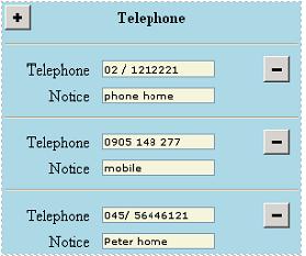 Components of Px Framework: PxGreatRepeater - component for entering data with repeating structure, maximum number of values is limitedThe PxGreatRepeater component is used to input data with cyclically repeating structure. Simple example of repeating data is a person who has got a telephone number or several phone numbers. The picture below shows the PxGreatRepeater control element for entering the phone number: ![]() Of course it is possible to enter more phone numbers using the PxGreatRepeater control element, see the picture below: ![]() Press the "+" button to add new boxes for entering the phone number, press the "-" button to delete the existing numbers. The example below shows how it works in practice. Add the following columns to the directory table: